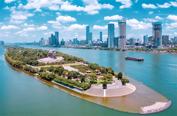 橘子洲位于长沙市区中湘江江心,是湘江下游众多冲积沙洲之一。橘子洲,西望岳麓山,东临长沙城,四面环水,绵延数十里,狭处横约40米,宽处横约140米,形状是一个长岛,是长沙的重要名胜之一,也是国家级重点风景名胜区。凝望着滔滔北去的湘水,青年毛泽东在长沙橘子洲头挥笔写就脍炙人口的《沁园春·长沙》,抒发了心忧天下、济世救民的壮志豪情。洲以人传,诗壮名城。橘子洲介名山城市间,凌袅袅碧波上,被誉为“中国第一洲”。